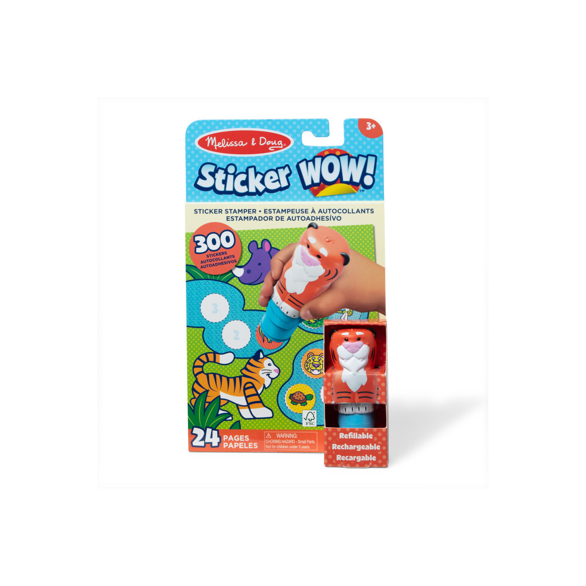 Melissa & Doug Sticker WOW!™ is a whole new way to play with stickers! Let the adorable, collectible Pumpkin the Tiger stamp, stamp, stamp its way through 24 pages of fun-filled, safari-themed counting, matching, and search-and-find activities. The refillable sticker stamper comes pre-loaded with a sticker stack of 300 assorted stickers – with 100 unique designs in every stack, each sticker is a surprise! Themed refill packs are sold separately and are compatible with any Sticker WOW!™ sticker stamper. Stickers are not reusable, but are easy to remove if necessary. Fill in the activity pages and use for creative art projects, such as bookmarks, posters, cards, and more. Easy-to-remove stickers and the convenient on-the-go format with built-in sticker stamper storage makes Sticker WOW!™ (patent pending) a great mess-free travel activity. Sticker WOW!™ promotes fine motor skills, encourages creative play, and it's satisfying, fidget fun!