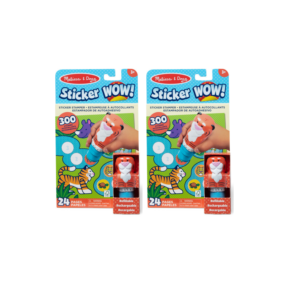 Melissa & Doug Sticker WOW!™ is a whole new way to play with stickers! Let the adorable, collectible Pumpkin the Tiger stamp, stamp, stamp its way through 24 pages of fun-filled, safari-themed counting, matching, and search-and-find activities. The refillable sticker stamper comes pre-loaded with a sticker stack of 300 assorted stickers – with 100 unique designs in every stack, each sticker is a surprise! Themed refill packs are sold separately and are compatible with any Sticker WOW!™ sticker stamper. Stickers are not reusable, but are easy to remove if necessary. Fill in the activity pages and use for creative art projects, such as bookmarks, posters, cards, and more. Easy-to-remove stickers and the convenient on-the-go format with built-in sticker stamper storage makes Sticker WOW!™ (patent pending) a great mess-free travel activity. Sticker WOW!™ promotes fine motor skills, encourages creative play, and it's satisfying, fidget fun! Sold as a pack of 2 complete activity pad sets.