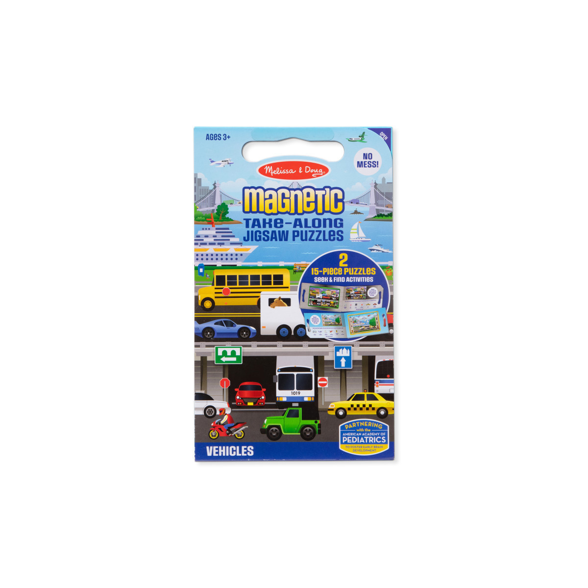 - Two 15-piece vehicle-themed magnetic jigsaw puzzles in a compact, fold-out format