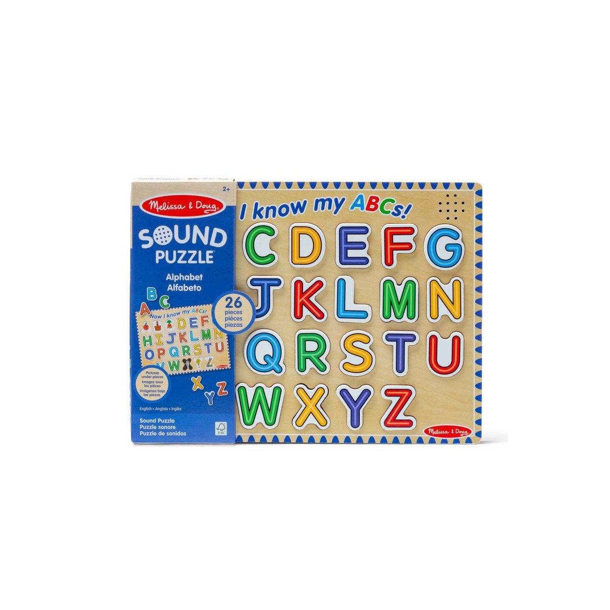 This 26-piece alphabet sound puzzle pronounces the name of each letter when it is placed correctly in the sturdy wooden puzzle board! Colorful wooden pieces are slightly raised above the puzzle board for easy grasping. Pictures underneath each piece help reinforce the relationship between letters and their sounds. Kids three and older will love learning their ABCs while developing fine motor and sensory skills. (TIP: Puzzle has light-activated sensors; for best results, expose the sensor by removing a piece in a brightly lit room, then make the sound play by replacing the piece in the board.)