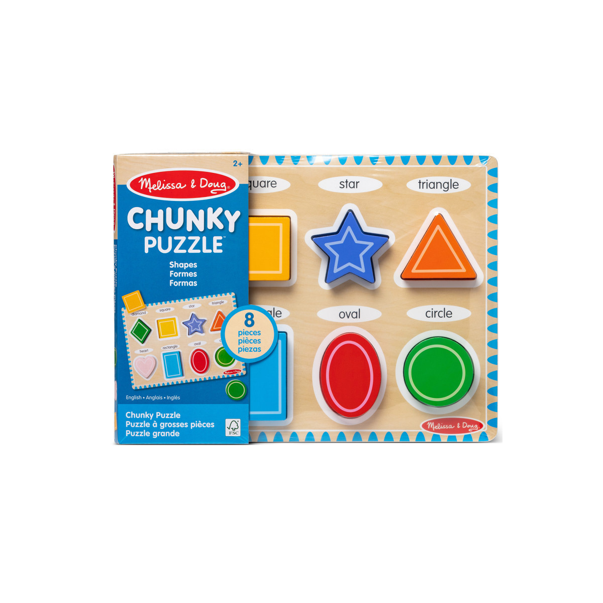 Eight familiar shapes are featured in this extra-thick wooden puzzle with easy-grasp, chunky pieces. Each piece has a matching picture underneath and the shape name is printed on the puzzle board. Encourages hand-eye coordination, fine motor skills and visual perception skills.