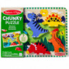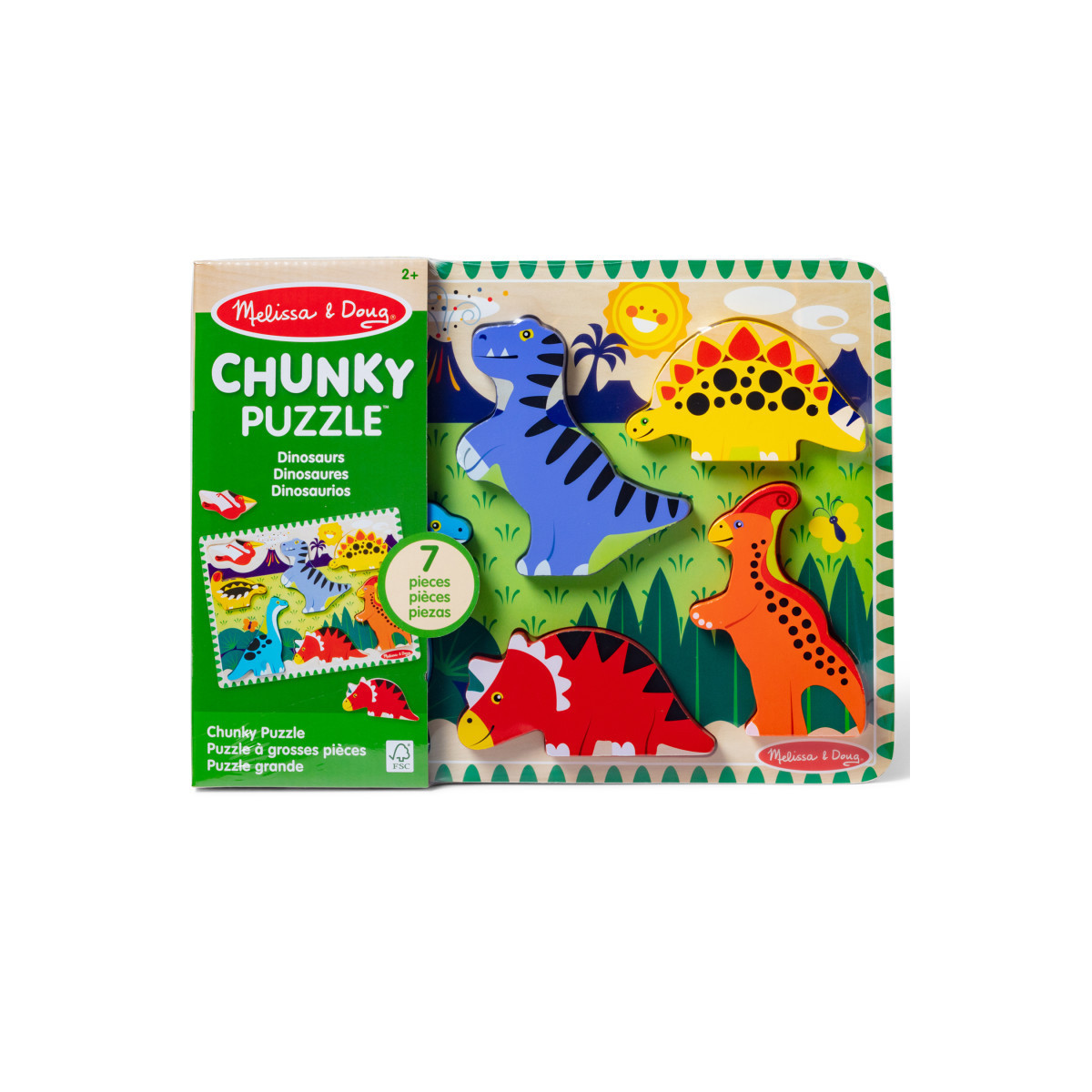 This extra thick wooden puzzle includes seven easy-grasp, chunky dinosaur pieces with a full-color, matching picture underneath. The dino pieces stand upright for pretend play. Encourages eye-hand, fine motor and creative expression skills.