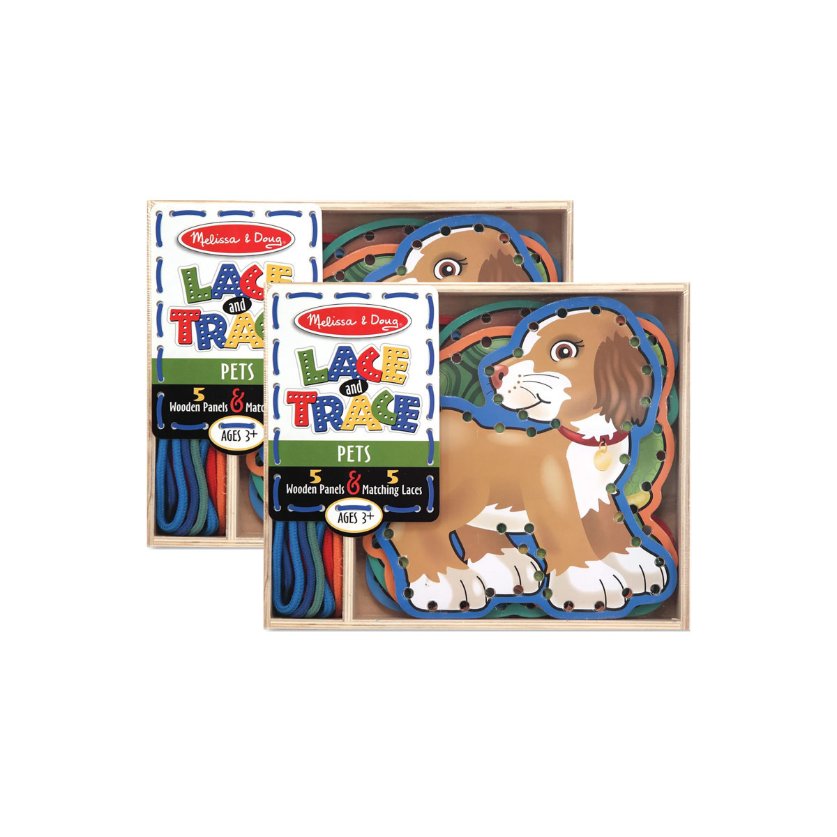 With adorable pets pictured on both sides, it's fun to practice lacing and tracing skills. This wooden set contains five sturdy, double-sided lacing panels, plus five color-coordinated laces! Develop hand-eye coordination and attention skills with this great activity. Each set includes 5 double-sided, wooden animals with 5 color-coordinated laces. Sold as a pack of 2 identical sets.