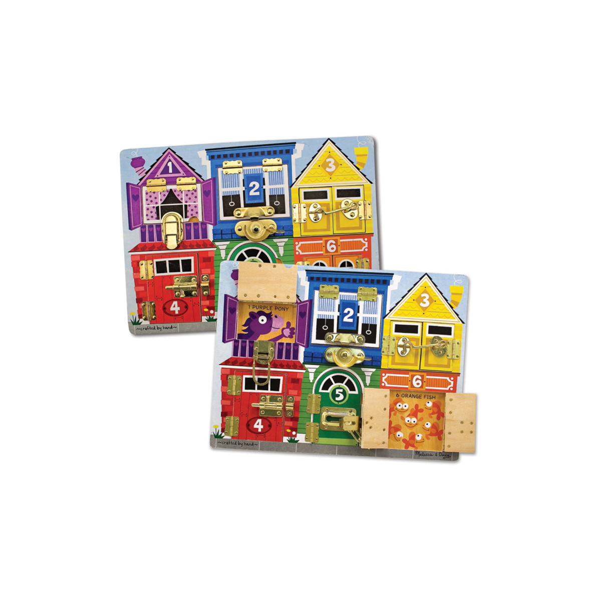 Undo a latch, swing open the numbered door, and count on fun when the picture beneath is revealed on this wooden play board