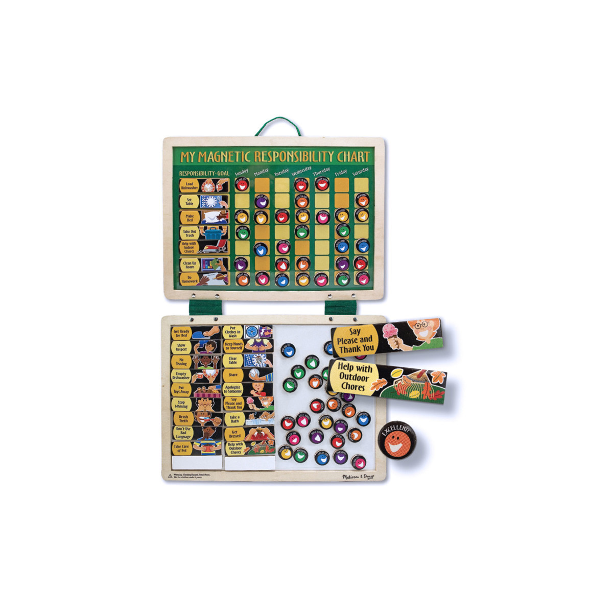 Catch children in the act of behaving well, reward them, and watch those appropriate behaviors multiply! Open the fabric hinged boards to reveal a behavior chart on one board, while the other board keeps all the magnets close at hand. A sturdy cord is attached for hanging. Dry-erase board and 90 magnets including responsibilities, positive behaviors and rewards. Here's a way to please (and thank you) everyone!