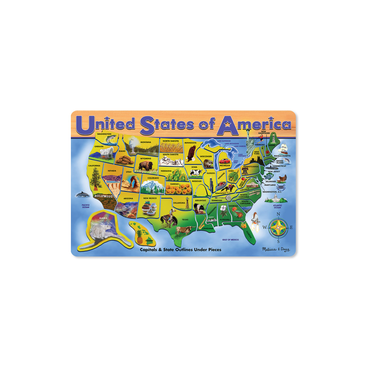 It's fun to learn the geography of the U.S.A. with this 45 piece, wooden puzzle. With colorful images associated with each state, plus the capital name and state outline under each piece, this puzzle is a bonanza of facts! The back of the puzzle lists additional state facts, including state flag, bird, motto, population and more!