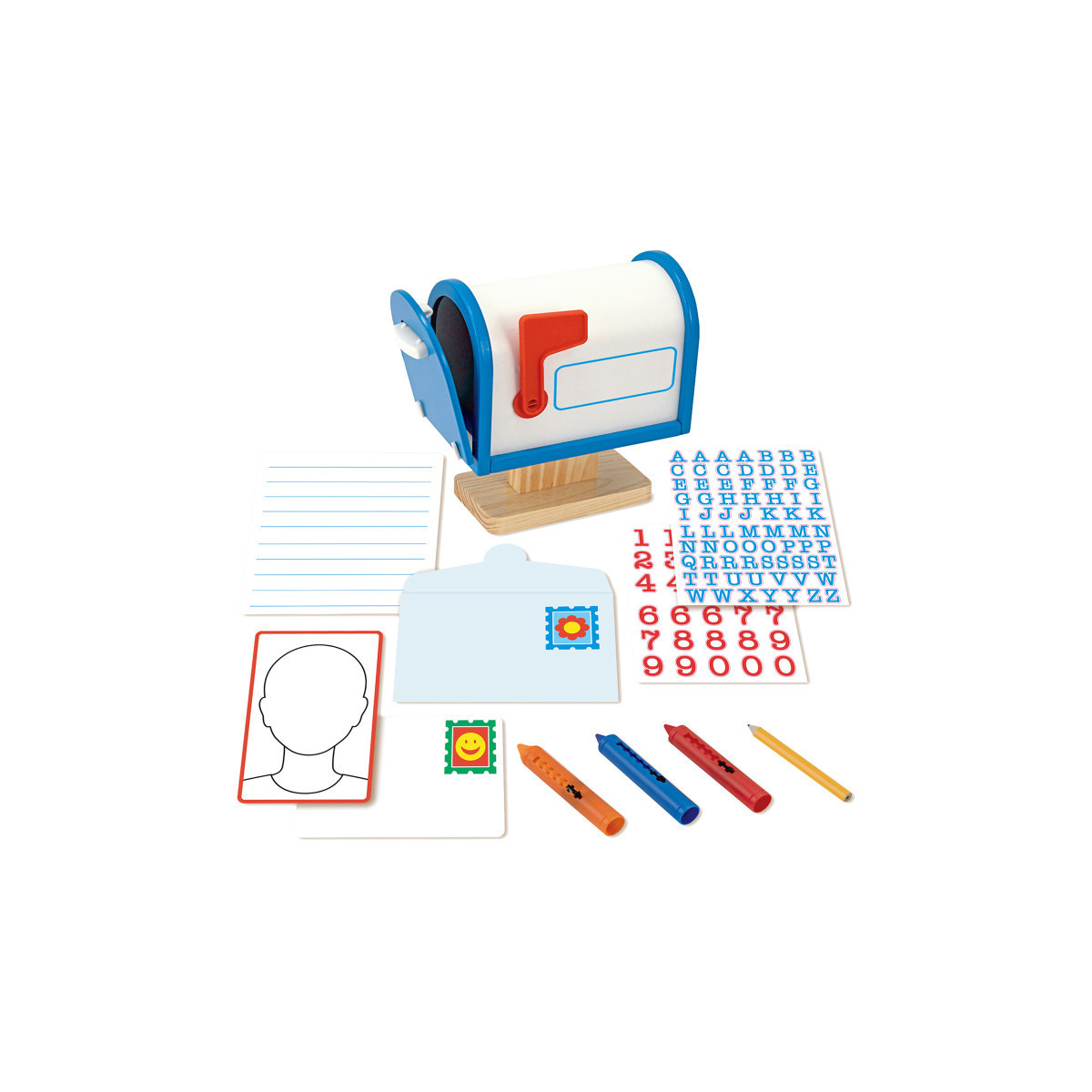 Everyone likes getting letters! Sending and receiving "mail" is even more fun with this toy mailbox, complete with a bright red flag. The sturdy wooden box comes with letter and number stickers so kids can decorate it with their name, address or a special message. The hinged door opens to make room for two postcards and a ruled letter and envelope, all reusable with the wipe-clean crayons that come with the set. Need even more inspiration? Drawing activities and play ideas are included to keep this letter box filled with creative correspondence and lots of fun! Melissa & Doug Classic Toys bring timeless play to modern families! Each toy is designed to fuel an endless world of imaginative play, while encouraging the kind of play-based exploration that naturally promotes key developmental skills. The sturdy wooden play pieces are tested to today's highest standards of quality and safety.