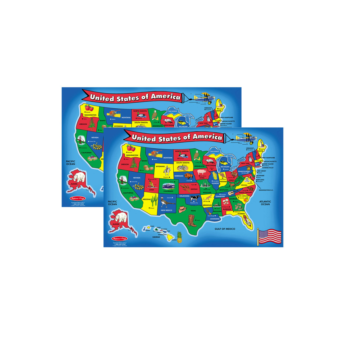 Geography comes to life with this cardboard floor puzzle, featuring 51 pieces cut to the shape of the state or region. 2' x 3' when assembled, the extra-thick pieces feature an Easy-Clean surface to keep them looking like new. Kids will have fun learning the states on this colorful, informative map puzzle. Sold as a pack of 2 identical puzzles.
