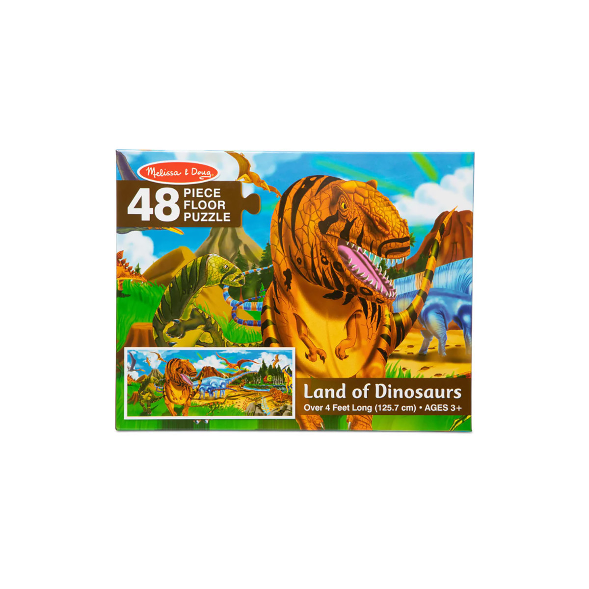The dramatic, detailed dinosaurs on this cardboard floor puzzle may be long extinct, but these 48 puzzle pieces will surely last for ages! Four feet long when assembled, the extra-thick puzzle pieces feature an Easy-Clean surface to keep them looking like new. It's an educational and entertaining challenge for any child to complete the puzzle and name the dinosaurs.