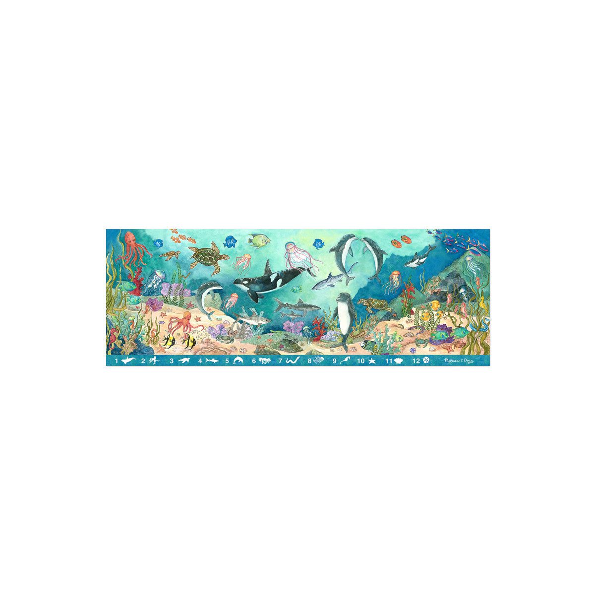This extra-large search-and-find puzzle offers an extra activity when completed! The 48 sturdy cardboard pieces assemble to reveal a stunning underwater scene filled with animals to spot and count. A visual picture list is printed right on the puzzle, encouraging counting games and picture-search activities with no reading required. Measures 50"L x 18"W.