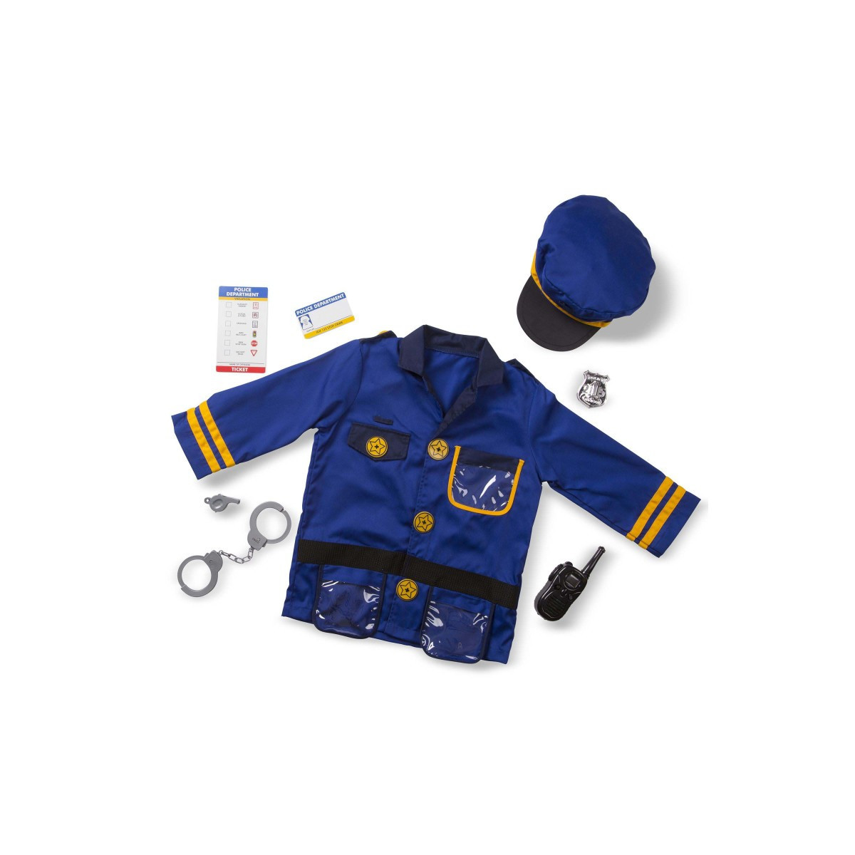 - Includes jacket, cap, whistle, handcuffs, badge, walkie-talkie with sound effects, and reusable name tag and ticket