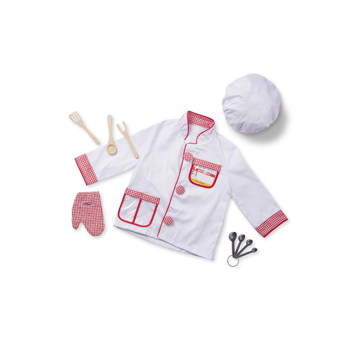 • Includes chef's jacket, hat, oven mitt, three wooden utensils, plastic measuring spoons and reusable name tag.
