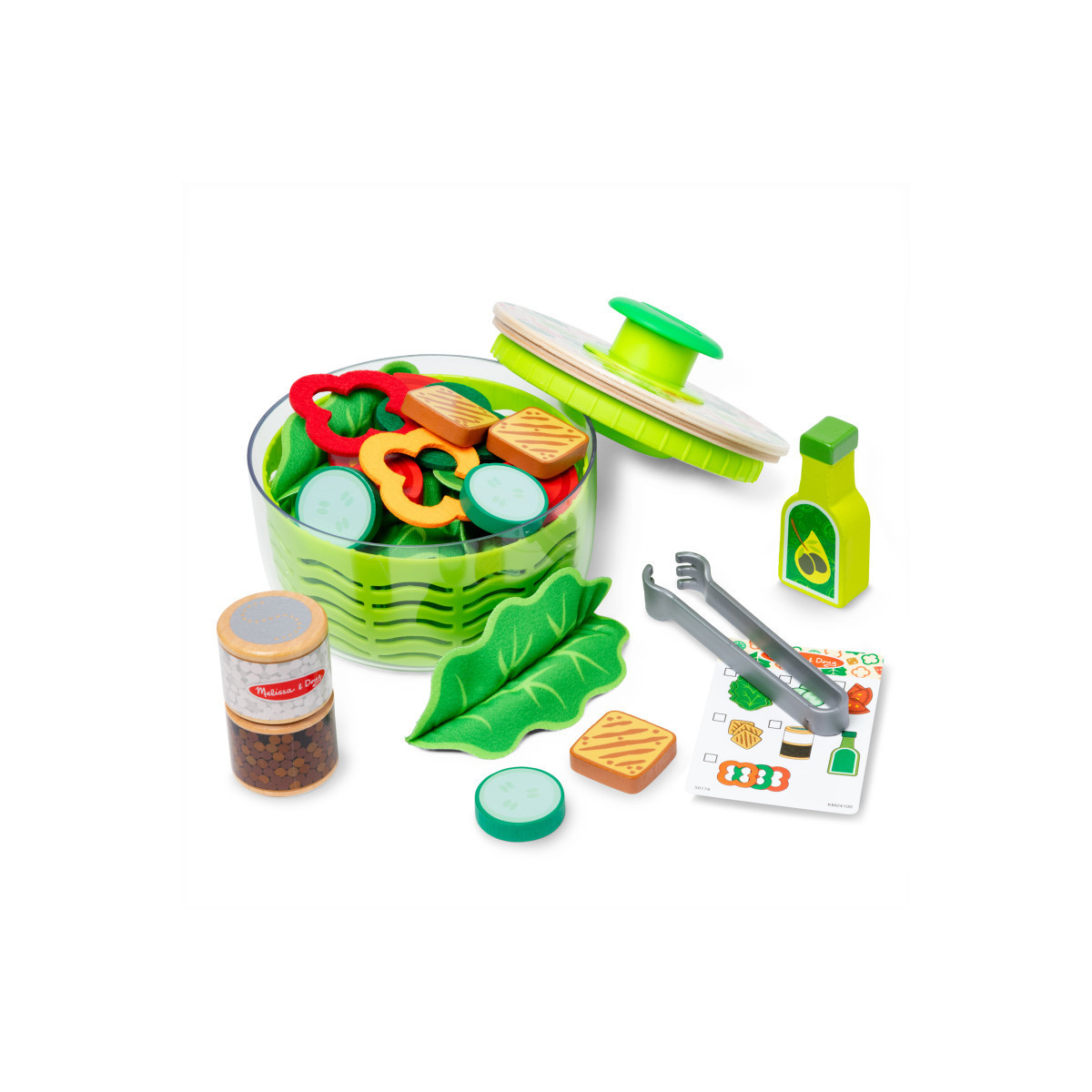 - 28-piece play set includes wooden spinner lid, spinner basket, salad bowl, plush head of lettuce with 8 peel-off fabric lettuce leaves, 3 felt peppers, 3 wooden cucumbers, 3 wooden tomatoes, 3 wooden croutons, wooden rotating salt and pepper grinder, olive oil bottle, tongs, reusable activity card
