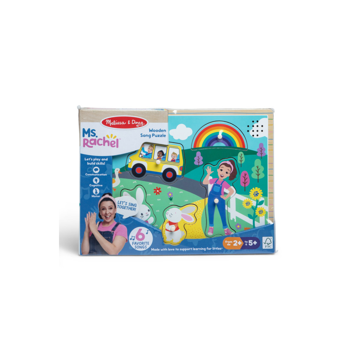 Kids will love singing along with their favorite educator, Ms. Rachel! The six-piece Melissa & Doug® Ms. Rachel™ Wooden Song Puzzle includes favorites from Ms. Rachel's popular baby and toddler videos. Lift to hear Come Play Out In the Sun, The Wheels on the Bus, I Love a Rainbow, Can You Say Mama, Hop Little Bunnies, and I'm So Happy. An on/off switch allows quiet play (batteries not included). Durable pegs help kids two and older easily grasp and manipulate the six adorably illustrated pictures and pictures under pieces help with matching and boost self-esteem. Encourage language, memory, spatial awareness, problem-solving skills and more with this Melissa & Doug puzzle and Melissa & Doug toys. These Melissa & Doug toys are toddler learning toys, designed by Ms. Rachel and developmental experts to support all children, through their ages and stages, from 2-5+ years. Ms. Rachel toys are ideal newborn toys, toddler toys, preschool toys, Montessori toys, and wooden toys for ages 2-4. From baby shower gifts to baby essentials, these products help babies and families learn, bond, and thrive. Ms. Rachel is a real teacher with two master's degrees in education. She is passionate about creating research-based videos and products to educate families and support learning for littles. This product is certified by the Forest Stewardship Council. FSC certification ensures that products come from responsibly managed forests that provide environmental, social, and economic benefits, and that forests are protected for future generations. Please note that FSC certification applies to new inventory only (FSC C156584).