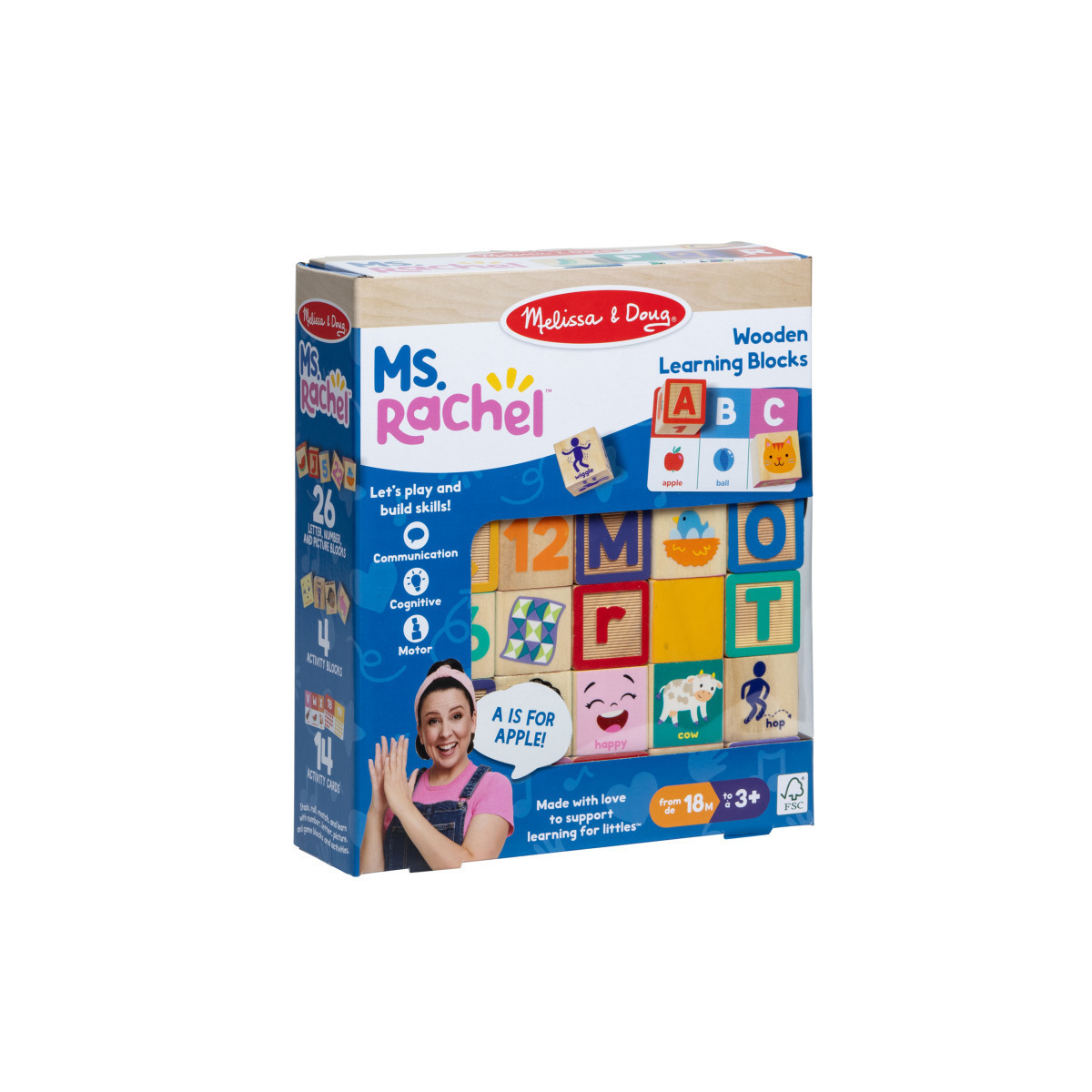 - OFFICIAL MS. RACHEL TOY: Stack, match, roll, and learn with 30 wooden letter, number, picture, and activity learning blocks and 14 double-sided activity cards, inspired by Ms. Rachel's popular videos