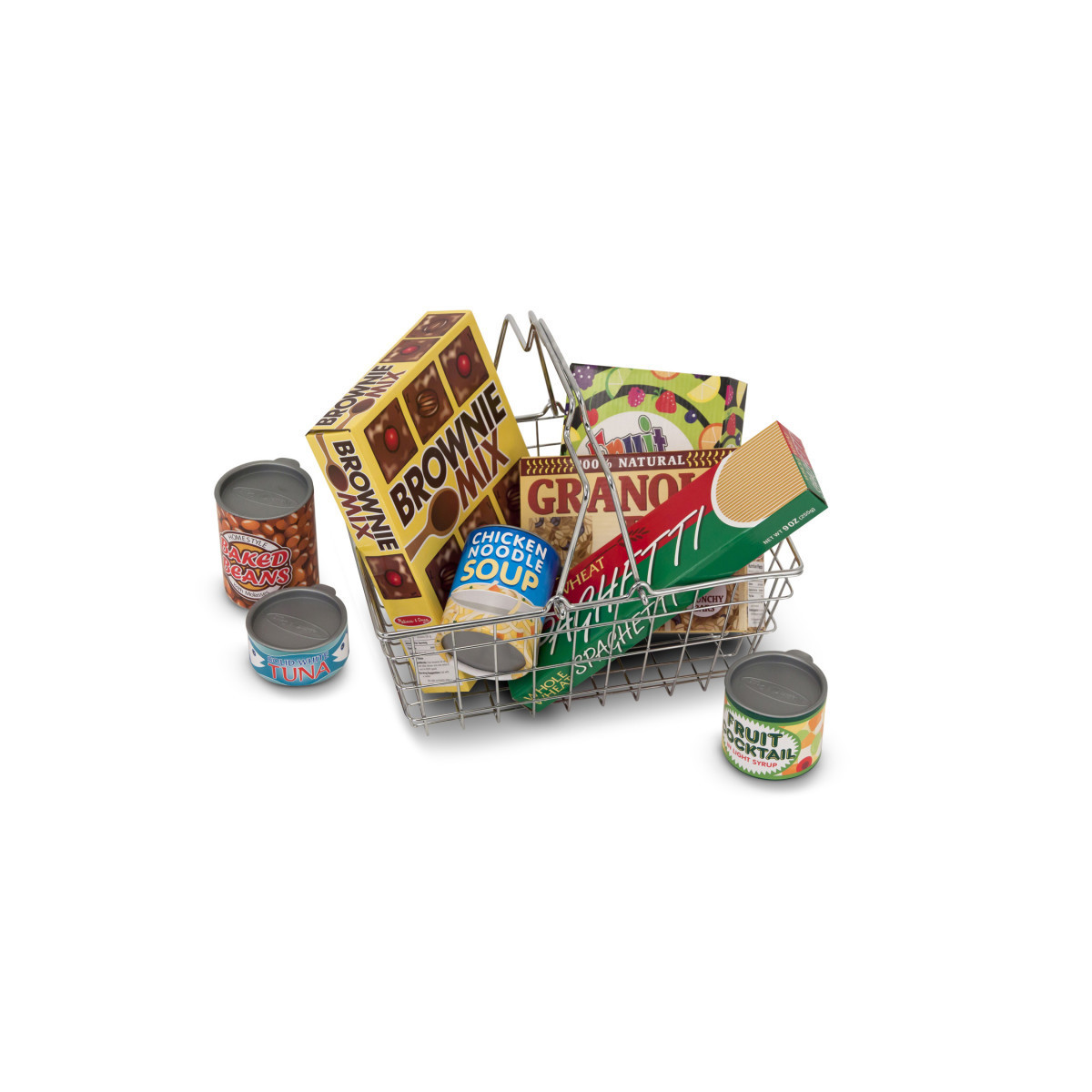 If make-believe fun is on your shopping list, check out this all-in-one kitchen and grocery play set! This realistic wire grocery basket toy is just the right size for pretend play. It comes stocked with play food boxes and play food cans with pop-off lid - in all, eight sturdy, colorfully labeled packages to stock, load and "cook." The wire basket is carefully designed to be comfortable to carry, easy to store and wonderfully durable. The sturdy handles fold flat for easy folding or stacking, then lift up to carry around the "shop."