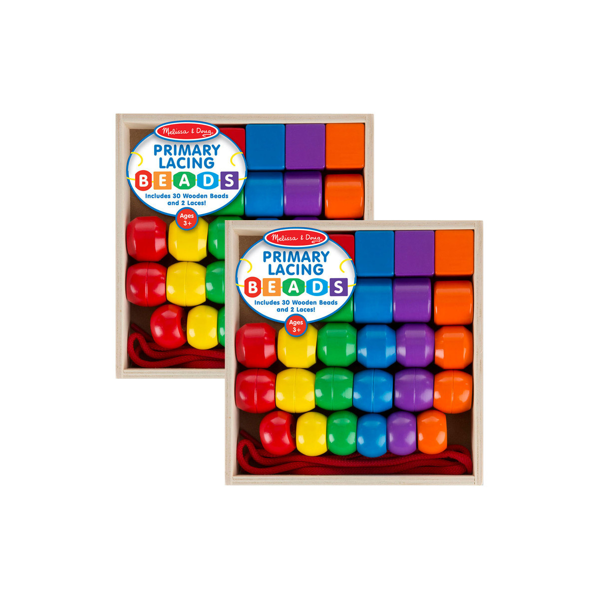 The bright and bold Melissa & Doug Primary Lacing Beads set is a must-have for budding imaginations! Each set includes thirty hand-painted, durable wooden beads in six vibrant colors, and two extra-long laces for plenty of hands-on play. Each set of beads features five distinct shapes all designed for little hands to grasp, and the laces are thin enough to allow the beads to slide easily. Stringing the beads provides opportunities for pretend play and learning. The activity helps to promote shape recognition, hand-eye coordination, fine-motor skills, cognitive and visual perception skills, and creative expression. The set allows adults and children to explore multiple playing activities together. Parents or grown-up kids can ask the child to sort the beads by color or shape, identify them for the child, and repeat the activity until the child can identify all the colors and shapes independently. The lacing bead set makes a great gift for preschoolers and kids ages three and older. Sold as a pack of 2 complete Primary Lacing Bead sets.