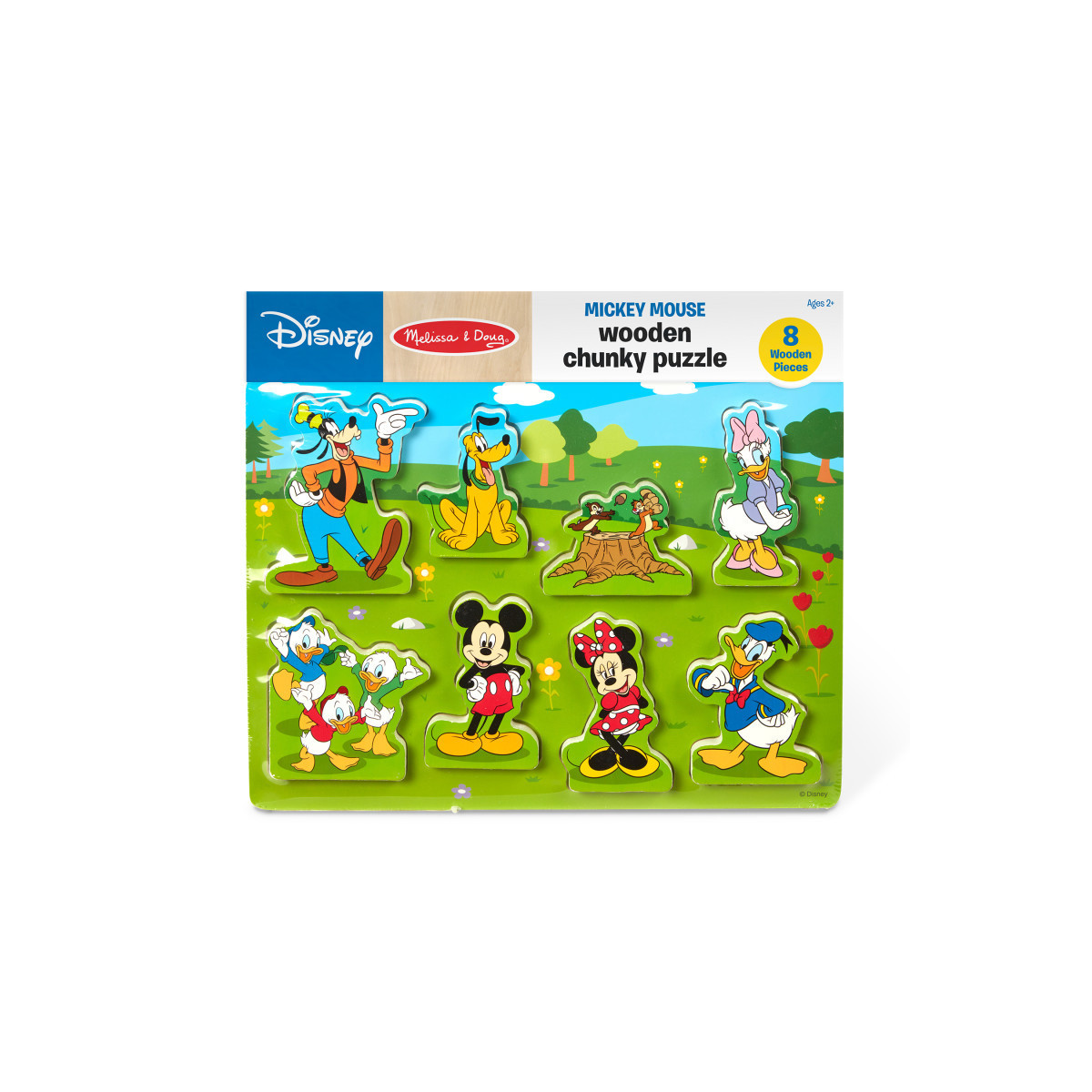 - 8-piece wooden chunky puzzle features Mickey Mouse and friends