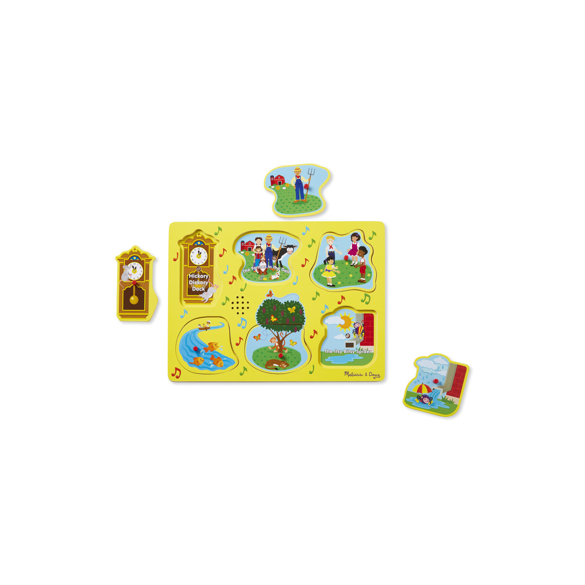 Sing along with favorite childhood characters like The Itsy Bitsy Spider and the Farmer in the Dell with this unique wooden peg song puzzle! Match the six illustrated wooden puzzle pieces to the pictures in the beautifully carved wooden puzzle board to hear six different nursery rhymes (Hickory Dickory Dock, The Farmer in the Dell, Ring Around the Rosie, Row, Row, Row Your Boat, Pop Goes the Weasel, and The Itsy Bitsy Spider). Plastic pegs make it easy for small hands to grasp and manipulate the pieces. Lyrics are included on the puzzle so kids can sing along as they complete the puzzle!