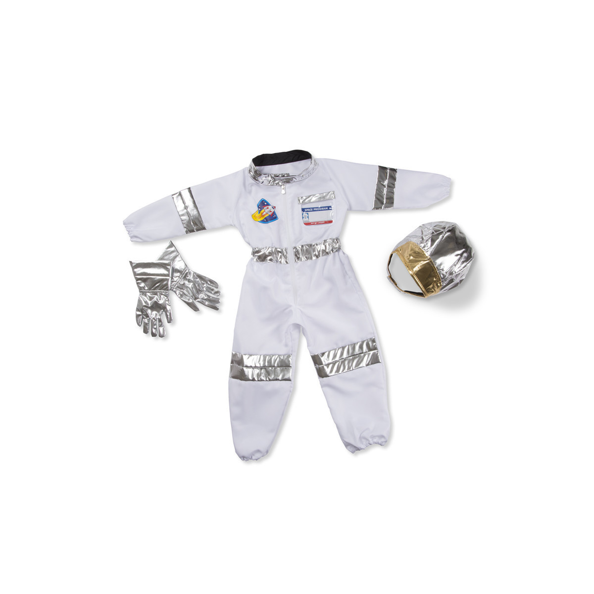 Houston, we have a costume. Kids will be over the moon when they get to step into the jumpsuit, slip on the stretchy silver gloves, and top it all off with the shiny helmet! There's even a reusable nametag that proudly IDs your little space explorer, then wipes clean so another astronaut can have a turn. This durable role play set is suitable for ages 3—6 and ready for any mission, whether it's piloting an imaginary rocket, exploring the distant galaxies at the other end of the house, or just striding dramatically toward your spaceship. Made of sturdy materials and built to last, the entire set is machine washable too!