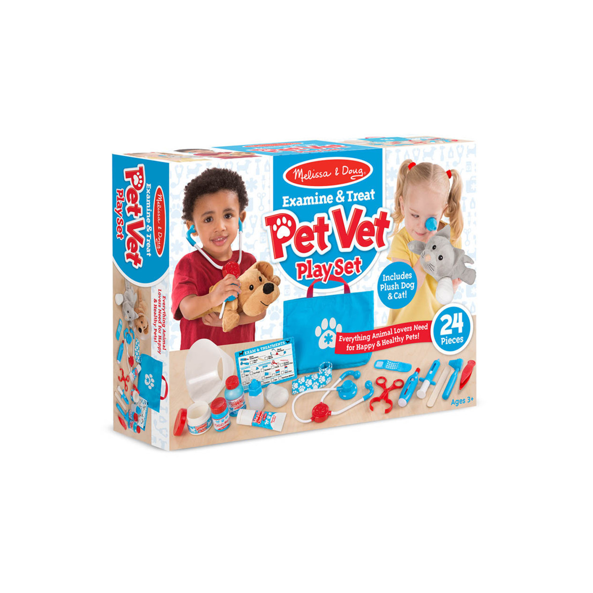 • 24-piece pretend play pet vet set with plush dog and cat and fun veterinarian role playing accessories