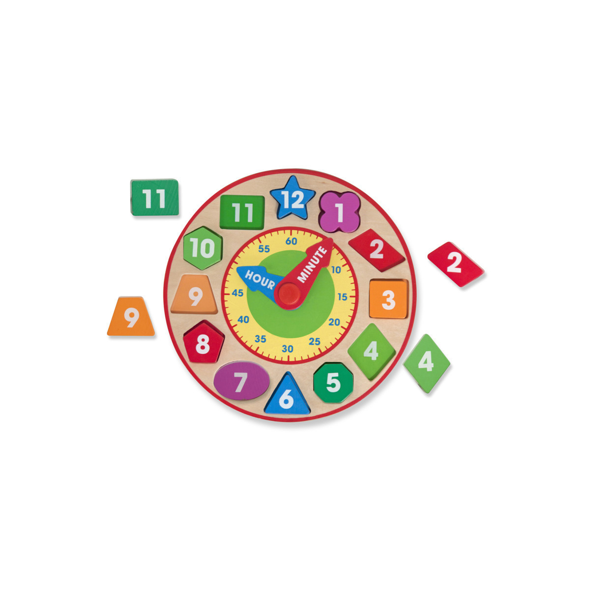 - Wooden clock with 12 removable pieces for teaching time-telling and more