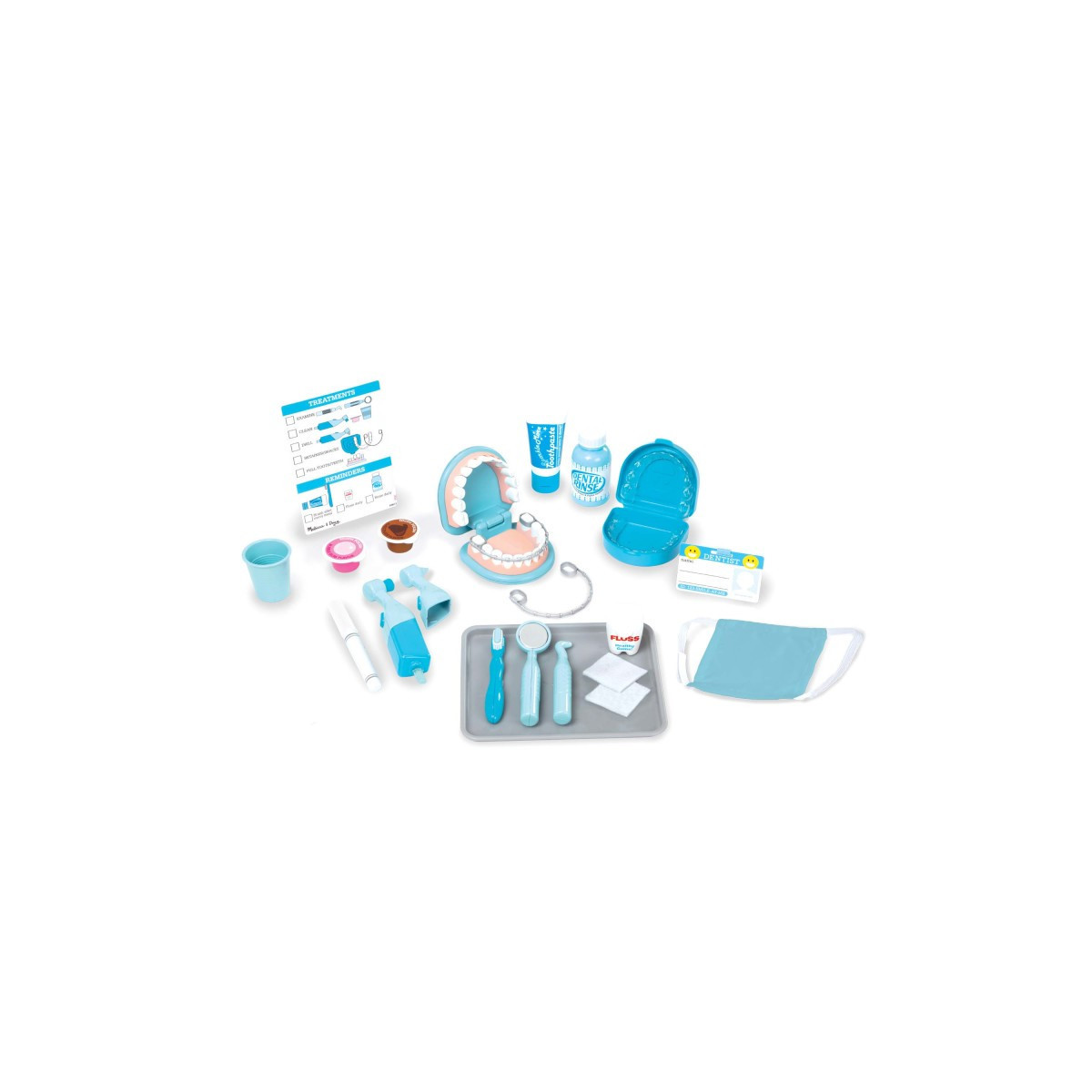 Smile, the dentist will see you now! This 25-piece dental care play set features an over-sized set of pretend teeth so young dentists-in-training can give cleanings, treat cavities, and even fit retainers and braces! Mark the pretend teeth with "cavity" stickers, then use the vibrating tool with interchangeable polishing and drill heads, and the toothbrush to clean. The set includes realistic instruments like a pick, mirror, and floss, a dental rinse bottle and cup, 2 gauze pads, 2 tooth polish cups, and an instrument tray to keep organized. A mask, reusable ID tag on a lanyard, and a double-sided reusable activity card round out the dentists office experience. The play set is a fun and engaging way to teach good dental health practices, and to ease kids fears or feelings of stress associated with a visit to the dentist. Spark a child's creativity and imagination, and to inspire young dentists for years to come.