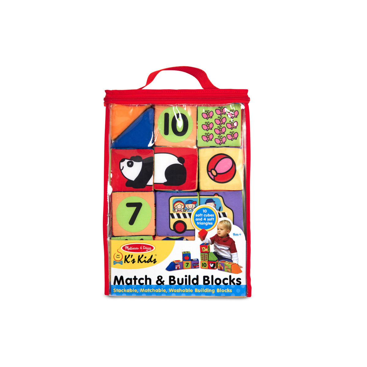 Build them up and knock them down--14 soft blocks combine in endless creative combinations . . . and topple with a gentle bounce that makes them safest for little ones. Match & Build Blocks can build much more than towers, too: This colorful soft-block set helps develop motor skills, logical connections, creativity, and more, so it grows along with a child, helping build key developmental skills along the way. Kid-friendly artwork on the coordinating cubes encourages matching activities (numerals with quantities, animal heads and tails, and everyday shapes), puzzling (complete the picture of a Ferris wheel!), and even sequential thinking and storytelling with before-and-after flaps on three of the blocks. With unlimited open-ended opportunities for learning and play, kids can also create their own sorting games and creative combinations--and of course, the 14 soft blocks make a terrific tower, castle, boat, or rocket ship! Melissa & Doug K's Kids toys nurture early childhood development in three key skill areas: physical, cognitive, and social. With interactive designs and multisensory features, K's Kids promotes constructive play and effortless learning, keeping interest high and new skills flourishing throughout the baby and toddler years!