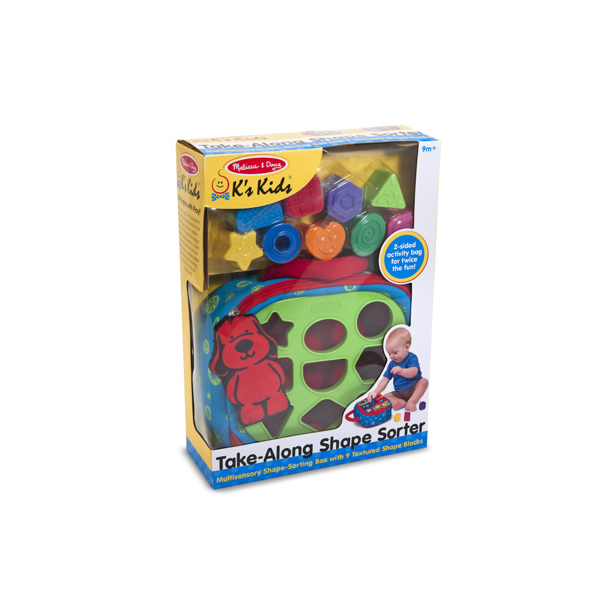 More than a shape sorter--this is an on-the-go activity center! Using nine plastic shapes and the padded carrying case, children can lift crinkly flaps, identify the pictures, match the shapes, and drop the textured blocks through the sorter . . . then pull the plush dog around the edge to unzip the case and start it all again! The baby- and toddler-friendly games and learning activities are great for enjoying together or for independent play, and are sure to keep little ones giggling while they learn. The easy-to-grasp padded handle makes it easy to carry the whole set from place to place--even for crawlers, scooters, and emerging walkers. Melissa & Doug K's Kids toys nurture early childhood development in three key skill areas: physical, cognitive, and social. With interactive designs and multisensory features, K's Kids promotes constructive play and effortless learning, keeping interest high and new skills flourishing throughout the baby and toddler years!
