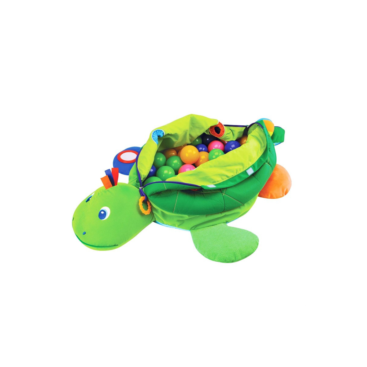 Kids will have a ball with this crinkling, jingling, multi-textured toy! The giant, friendly turtle comes filled with 60 squeezable multi-colored balls that are easy to grasp, toss, and roll. Zipper and self-stick tabs open so baby can sit inside, and close to store balls and to make a fun pillow. Features include holes to push and pull balls through, a non-slip bottom, crinkling feet, squeaking button, textured ring, mirror, silky fabric tags, and attached soft ball rattle.