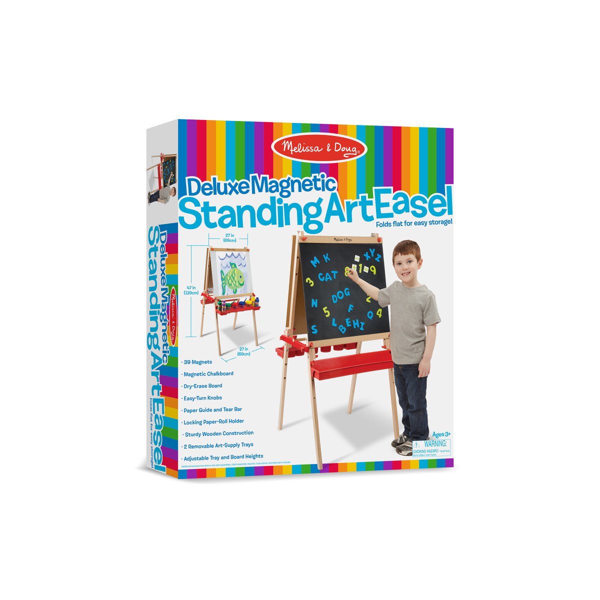 Help spark creative expression in your budding artist with this generously sized, deluxe wooden easel featuring both a magnetic chalkboard and a dry-erase board. The removable plastic trays mean that kids have loads of easy-reach art supplies (not included) at their fingertips. Plus 39 letter and number magnets that are great for extended play! Please note: this easel can hold either an 18" wide or 12" wide paper roll (not included).