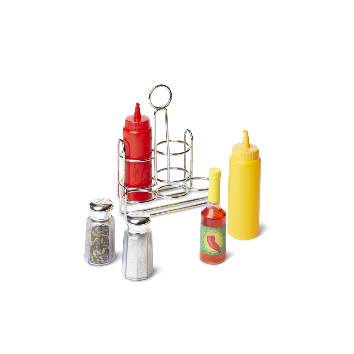 A must-have for the well-appointed play kitchen, these condiments sound and look like the real thing! Packaged in a handy metal caddy to keep everything organized, the six-piece set includes ketchup, mustard, salt, pepper, and hot sauce. Best of all: The salt and pepper really "shake," the hot sauce really "pours," and the ketchup and mustard "squirt" string! These wonderfully durable play pieces are built to last through countless culinary adventures.