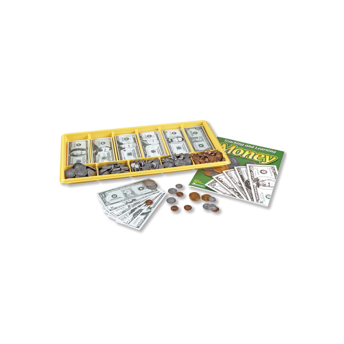 Jumbo money tray is filled with 100 plastic pennies, nickels, dimes and quarters; 50 half-dollars; 100 each of 1, 5, 10 and 20; and 50 each of 50 and 100 play money bills. Includes 64-page Money Activity Book. Tray measures 10.2" x 18.6". Ages 5 to 9