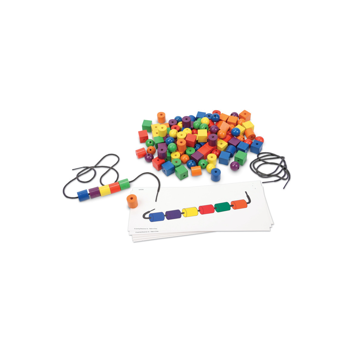 Colorful wooden spheres, cubes, and cylinders provide plenty of patterning practice, a prerequisite for early reading and math activities. Includes: 20 Activity Cards, 108 beads in 6 colors (red, yellow, orange, blue, green and purple). 2 — 36" black laces with 1" plastic tips, Activity Guide. Beads measure 3/4"- 7/8" each. Card measures 11 1/4" x 4 3/8". Grades: PreK+. Common Core State Standards Alignment: Counting & Cardinality, Measurement & Data. Learning Styles: Tactile, Visual. Skill Development: Basic Concepts — Colors, counting, and learning about similarities and differences are all a part of pattern play. Work together with students to group the beads in different piles by color or shape. Then begin to create patterns to help students identify the different attributes and recognize what comes next. Math —As students bead a repeating sequence of colors and shapes, they are creating AB patterning (e.g. red, blue, red, blue). Through patterning, students are beginning to recognize order and predictability. Add to the fun by counting the beads as they are laced in place. Fine Motor — Picking up the individual beads uses pincer grasp and strengthens the muscles in the hand needed to write and perform daily living skills, like getting dressed and brushing teeth. Using two hands to play by holding the lace steady with one hand and picking up and placing the beads on with the other helps develop the ability to use hands cooperatively.