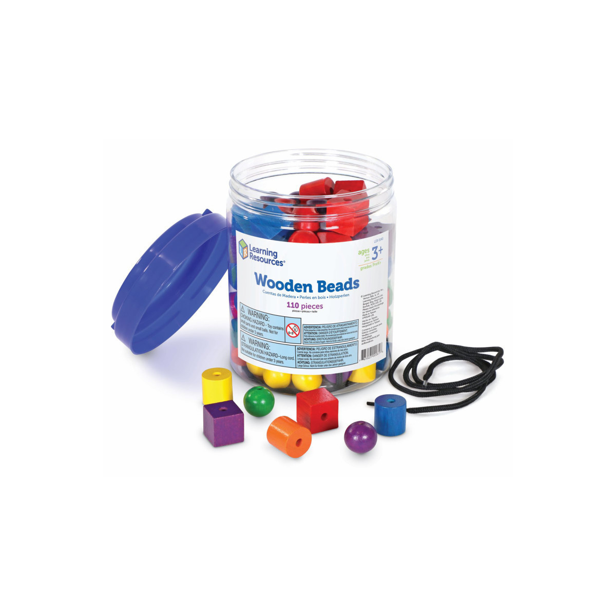 This set of colorful hardwood spheres, cubes and cylinders with laces provides plenty of pre-reading and early math practice. Set includes 108 beads in six colors and two 36" black laces with 1" plastic tips.