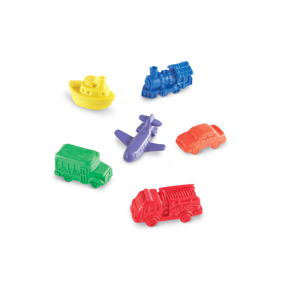 Great party favors! Whimsical vehicles shift imaginations into high gear. This set of 72 soft rubber counters comes in six colors and shapes including car, train, airplane, tugboat, bus and fire engine. Packaged in a reusable storage bucket. Counters measure 1.5" - 2" long and come in six shapes and colors. Ages 3 to 7.