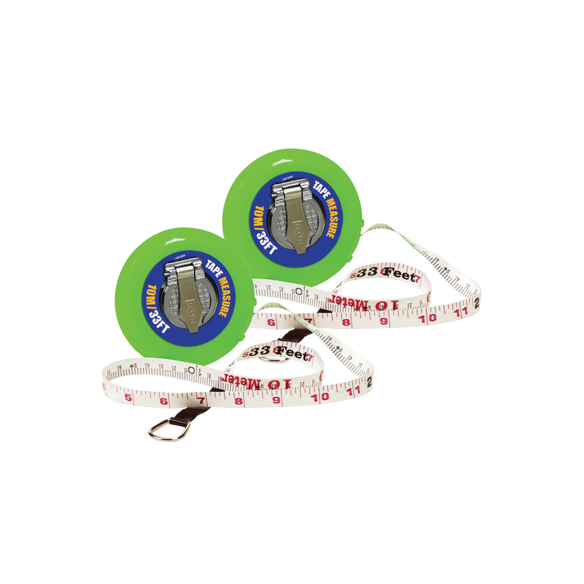 Fiberglass measuring tape is marked in cm and mm on one side and inches on reverse. Rolls into sturdy case. Tape measures 10m/33'. Sold as a pack of 2.