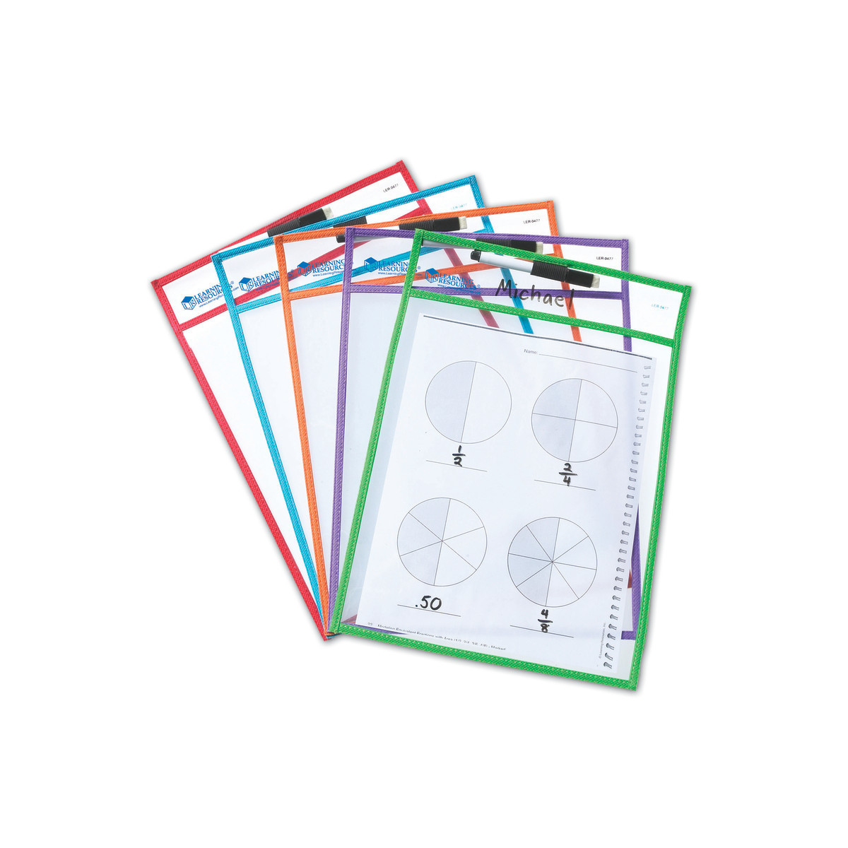 Each set includes 5 pockets and 5 dry-erase markers with eraser tips