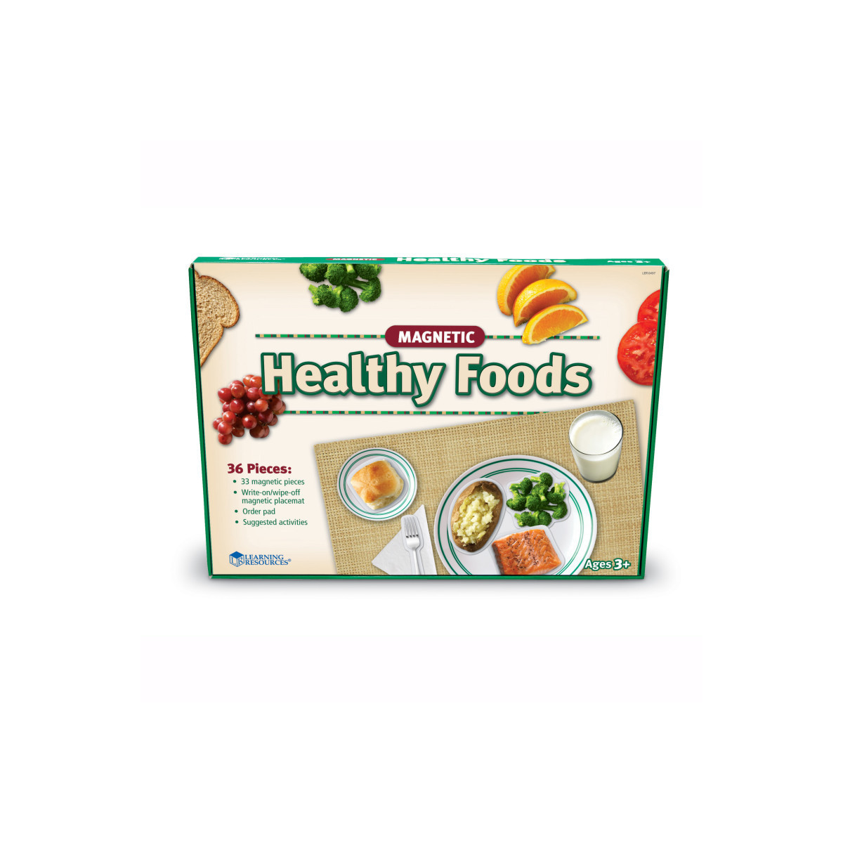 Introduce children to the concept of the 5 food groups and healthy meal planning with this set of magnetic, illustrated foods. Includes: 33 Magnetic pieces, 1 Write & wipe magnetic placemat, 1 Menu pad, Activity guide. Placemat measures 16.5"L x 12"H. Grades: PreK+. Learning Style: Visual. Skill Development: Social & Behavioral- The suggested activities can assist students with identifying and choosing healthy foods at a restaurant or in the grocery store. The set can even help students visually plan out food purchases using the included menu pad to stick to a list! Social & Behavioral- Use to teach students about table manners such as how to set the table or use a napkin. The Magnetic Healthy Foods can also assist with developing independent daily living skills like planning out meals for breakfast, lunch, and dinner. Basic Concepts- Promotes identification of the 5 food groups- fruits, vegetables, grains, protein and dairy. By learning about the food groups, students are creating building blocks for maintaining a healthy diet.