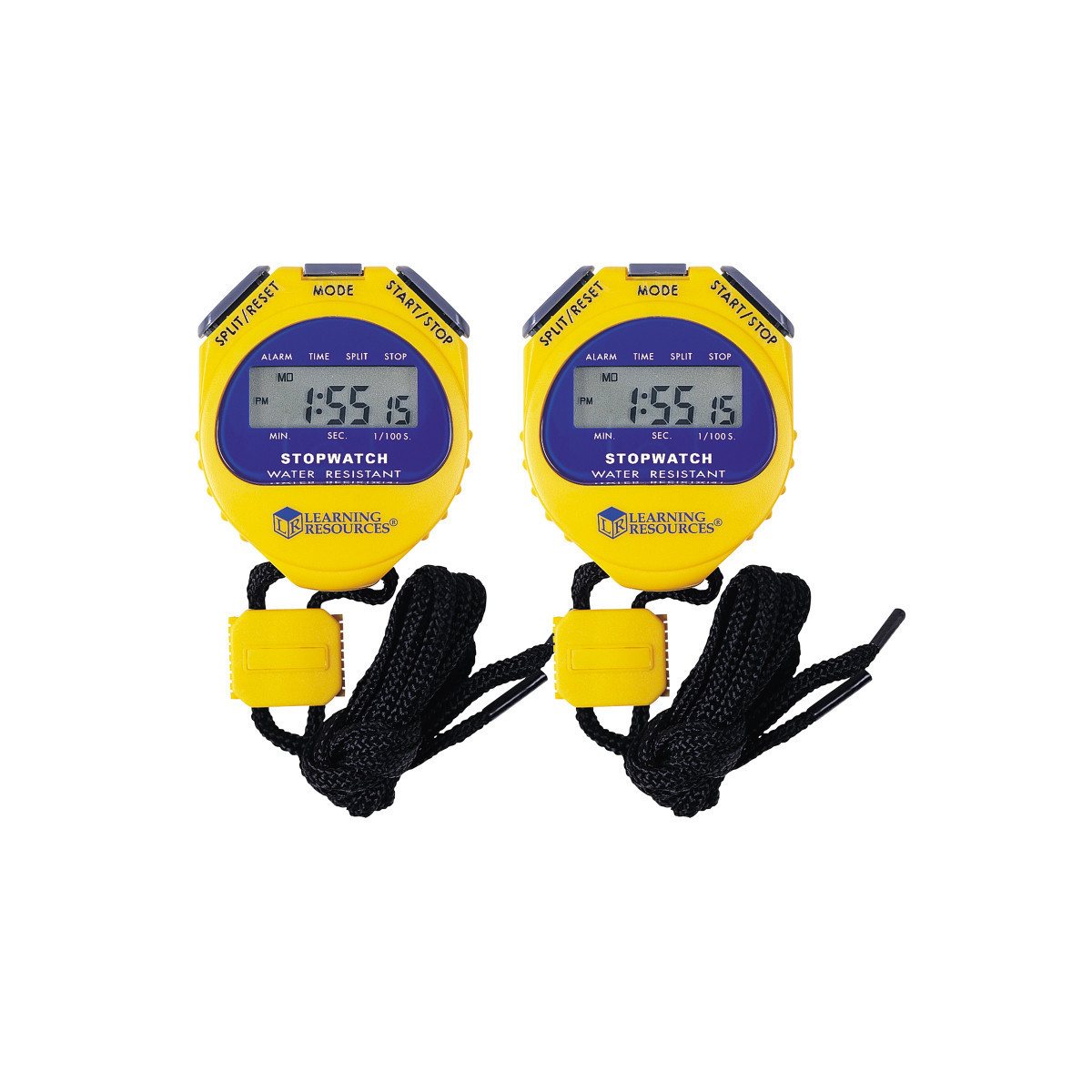 Easy-to-read display in 0.01 second increments. Features include 12- and 24-hour time, calendar/date display, alarm with hour chime/snooze feature, split-time functions and neck cord. Waterproof. Sold as a pack of 2 stopwatches.