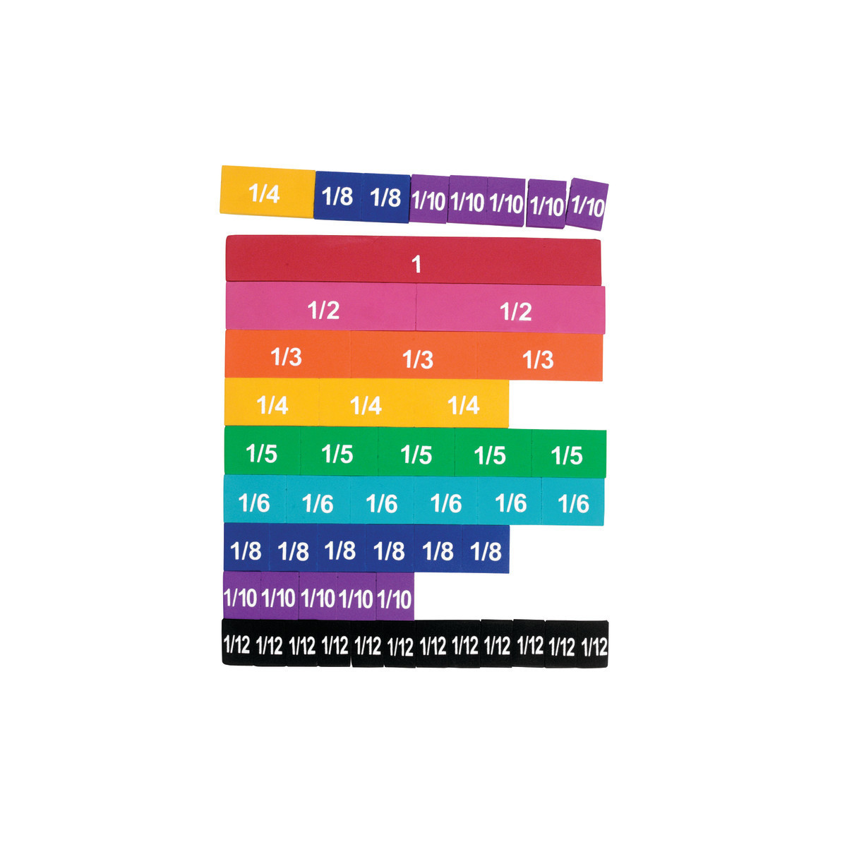 Soft Foam Magnetic Rainbow Fraction® Tiles This set of 51 color-coded soft foam magnetic tiles provides a visual and tactile way to teach fractions, relationships and create bar graphs. Demonstrate wholes, halves, thirds, fourths, fifths, sixths, eighths, tenths and twelfths. Good for classroom or small group use and color-coded to correspond to the Rainbow Fraction® system. Use with any magnetic white board or Magnetic Tabletop Pocket Chart.
