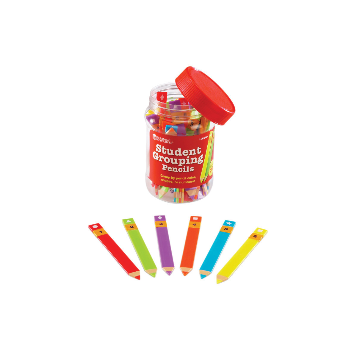 Simplify classroom management with this set of 36 Student Grouping Pencils. Durable plastic pencil-shaped organizers contain enough space to write a student's name. Use to group students randomly for cooperative learning or to ensure that you call on every student to participate. Group students by color, number or shape on their pencils. Packaged in a convenient storage jar. Pencils measure 4 1/2"L x 1/2"W.