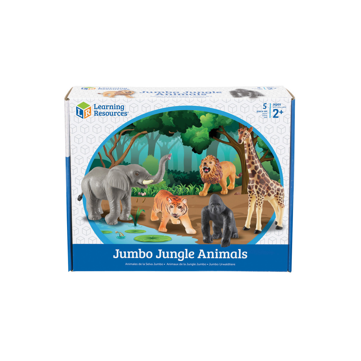 Children will go on their own jungle safari with these jumbo animals! Realistically detailed figures invite imaginative play and are perfect for vocabulary development. Made of durable, non-toxic plastic. Each animal wipes clean easily. Includes: Lion, Tiger, Gorilla, Elephant, Giraffe, Activity guide. Largest animal (giraffe) measures 8"L x 11.75"H. Grades: Toddler +