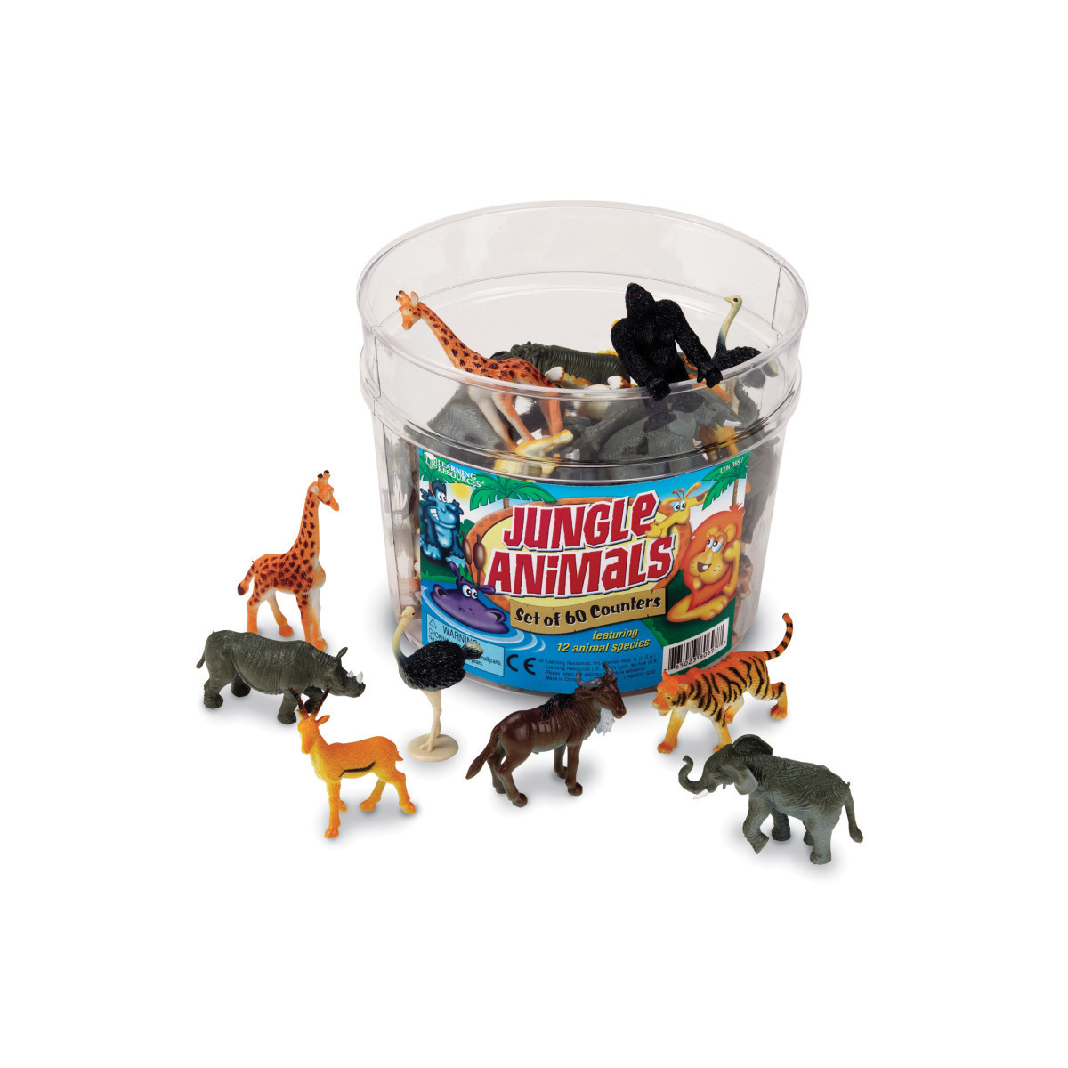 Your little animal lover will fall in love with this set of jungle animal counters. An imaginative way to learn to count, sort and classify as well as learn about exotic creatures in distant lands. This set of 60 beautifully detailed jungle animals includes 5 each of 12 different species. Includes "Did You Know?" animal fun facts to encourage children to learn more. Packaged in a reusable storage bucket.
