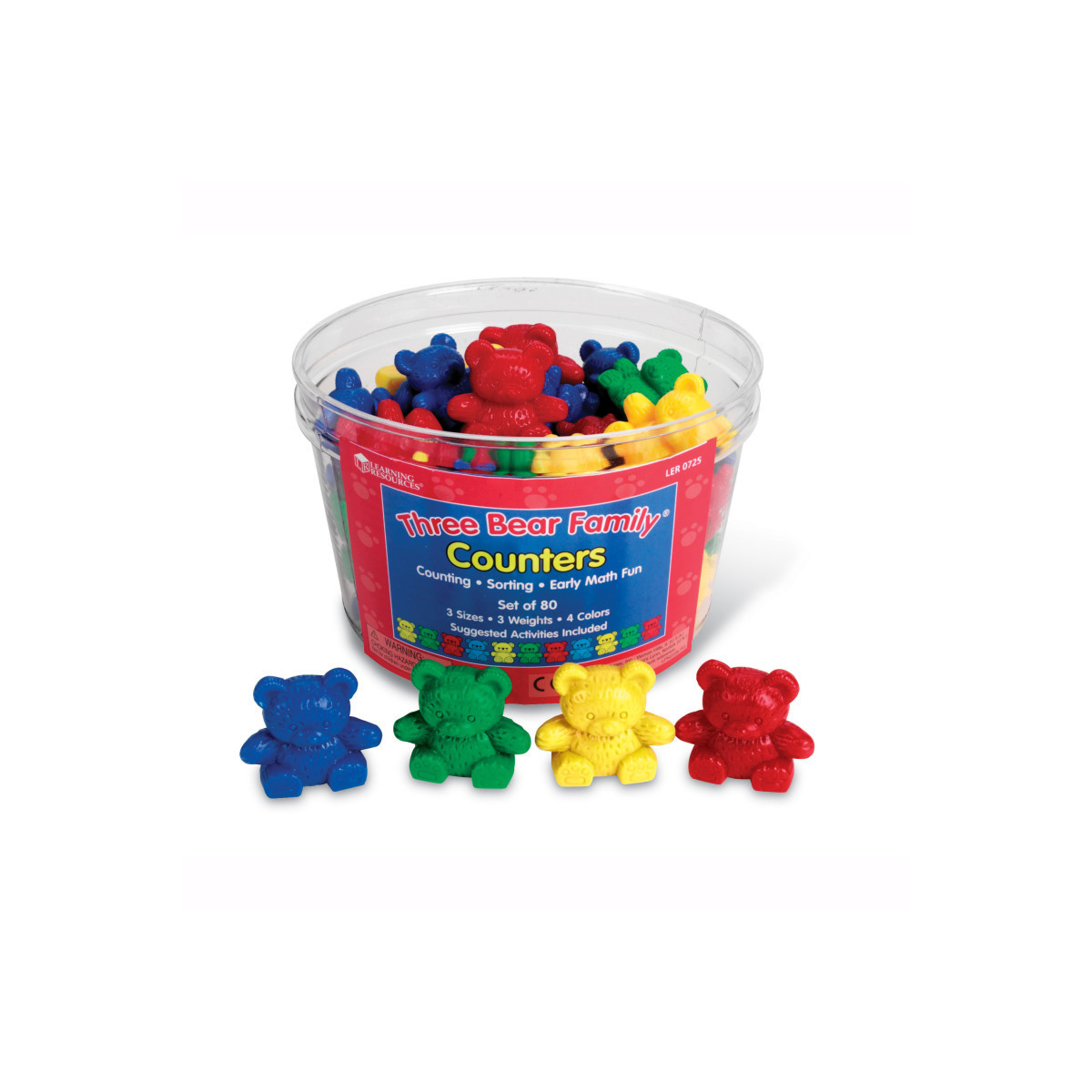 This adorable set of plastic bears comes in three sizes, three weights and four colors. Not only will your little ones enjoy playing with these bears, but learn size recognition, counting and sorting. Bears are also proportionally weighted and can be used on a balance for measurement discoveries. This 80-piece Basic Set contains 20 Papa, 20 Mama and 40 Baby Bear counters in four colors. Packaged in a reusable storage container. Counters measure between 1" and 1.5".