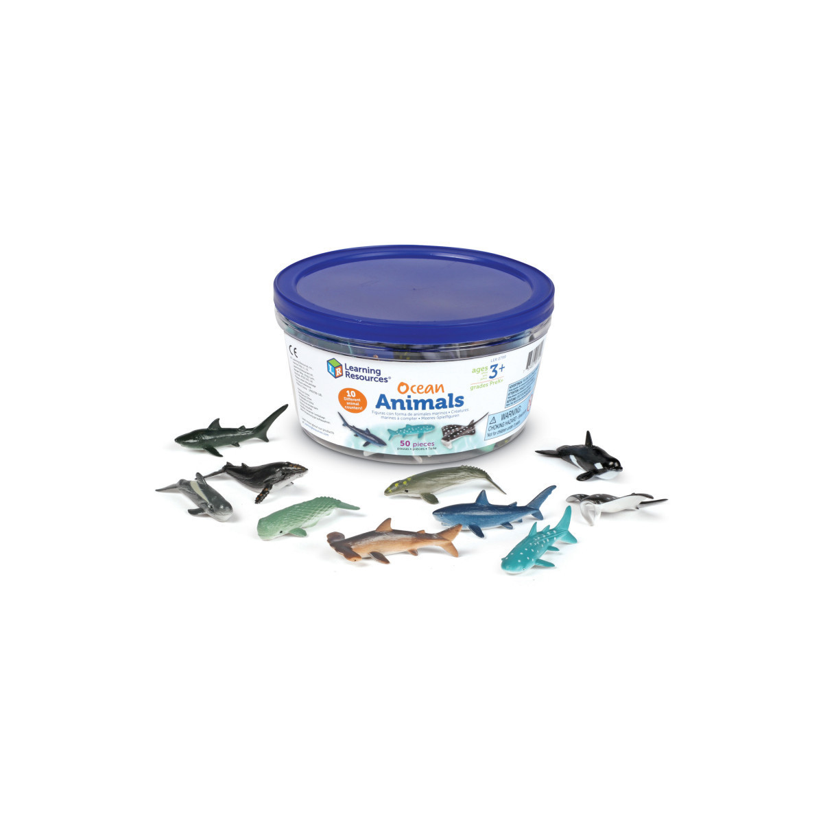 Explore the world of undersea ocean animals—in miniature! Sharks, whales, and other majestic ocean animals come to life in this set of Ocean Creatures. Fuel your kids' imagination with this set's 50 painted ocean animal counters, featuring 10 different whales, sharks, and more! Explore the depths of the deepest ocean with a gentle whale, go on the hunt with a great white shark, or hitch a ride with a manta ray—this set has them all! In addition to adventurous games of preschool pretend beneath the waves, the Ocean Creatures also double as animal counters, and work well for learning skills including counting, sorting, matching, and more. When all the learning fun is done for the day, the Ocean Creatures can head back to their very own home—not the sea, but this ocean animal set's reusable plastic storage tub that keeps each animal counter safe until the next high tide.