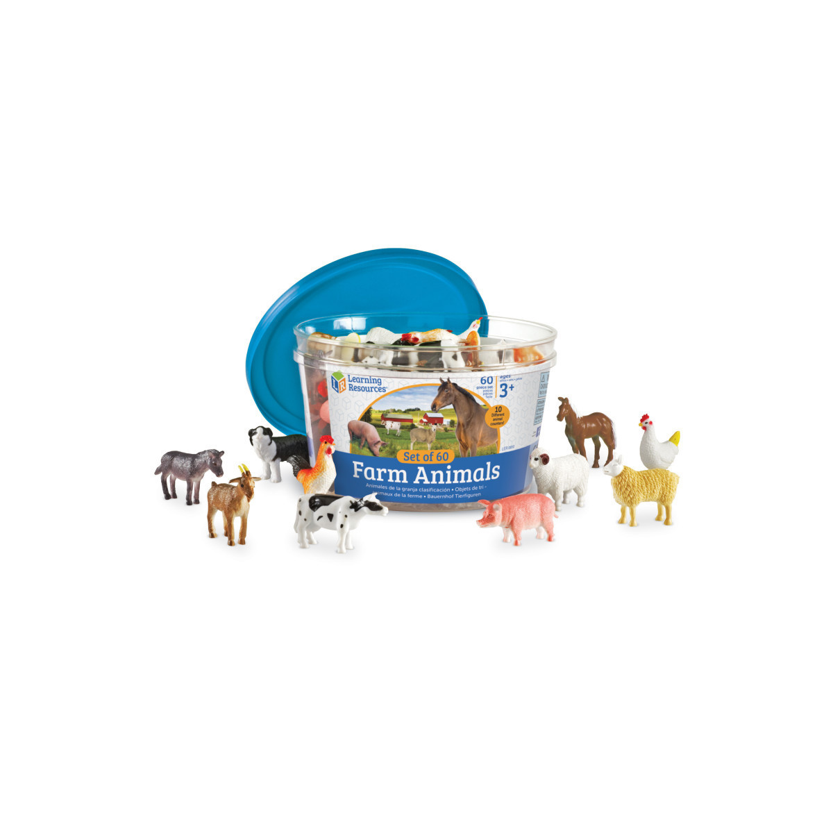Includes 6 each of 10 animals (horse, pig, rooster, hen, cow, goat, sheep, dog, ram, donkey) in a durable storage bucket.