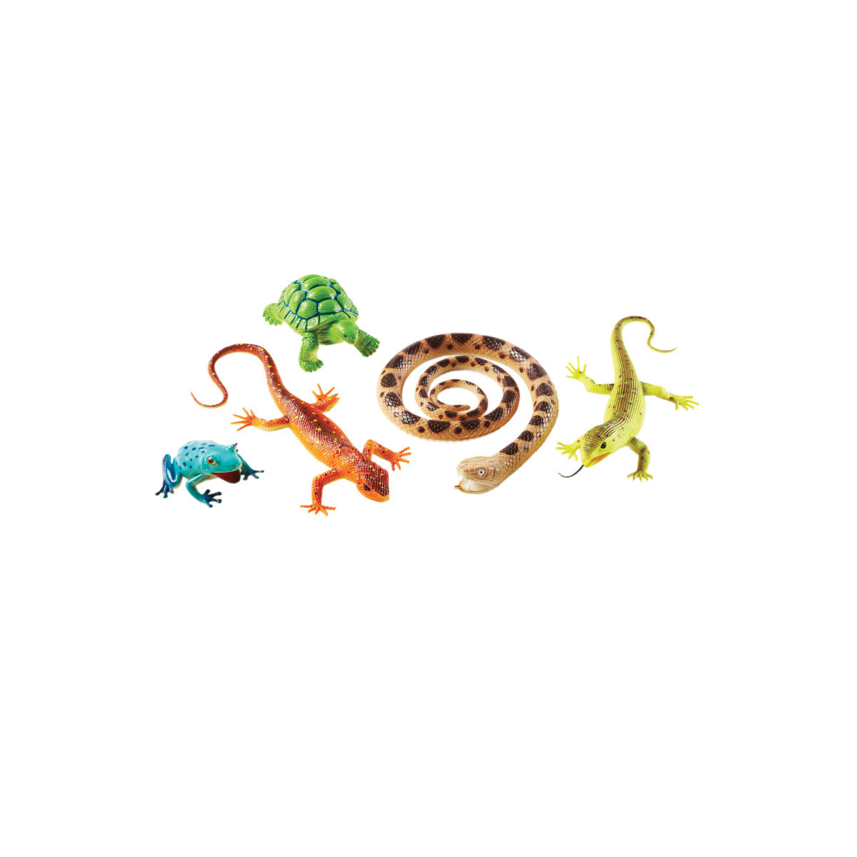 - Set of five jumbo animal figures inspired by popular reptiles and amphibians, including a tortoise, gecko, snake, iguana, and tree frog