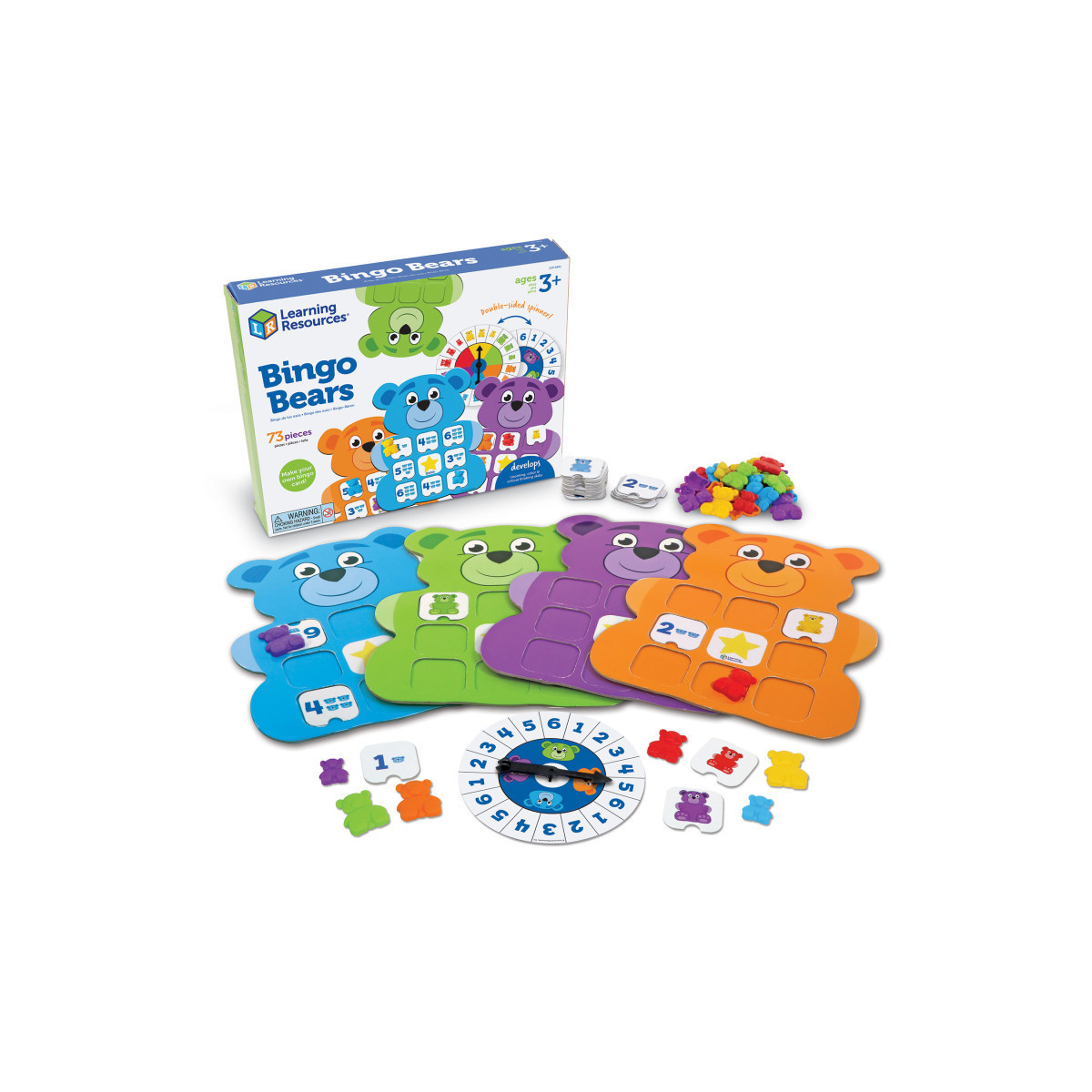 When you play bingo with these bears, it's never the same game twice! Kids build counting, color, and other toddler preschool learning skills every time they challenge the Bingo Bears from Learning Resources. This skill-building take on the classic game of bingo gets kids thinking from the very beginning—with this toddler brain toy, you build your own bingo cards, so it's never the same game twice! Once kids have assembled their cards, they can choose from this set's two smart bingo game modes—kid can either match their pieces by number, or sort and match by color and size on their way to victory! In addition to building school-ready counting and color skills, kids also learn essential social-emotional learning skills, including taking turns, following directions, and more. This educational toy for 3 year olds includes 36 of our popular Three Bear Family® Counters in three sizes and six colors, so kids can also use this set as a color teaching toy! Bingo Bears makes a great addition to collections of educational indoor games for homes and classrooms!