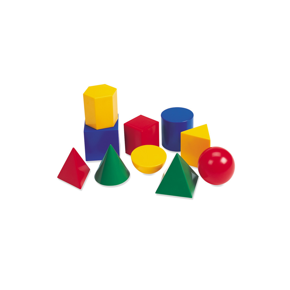 This big bright set of shapes make exploring geometry fun! Shapes have a common 3-dimension to illustrate relationships between area, volume, shape, form and size. Plastic shapes include: cone, sphere, hemisphere, cube, cylinder, rectangular prism, hexagonal prism, triangular prism, square pyramid and triangular pyramid. Teaching Notes included. Ages 5 to 10
